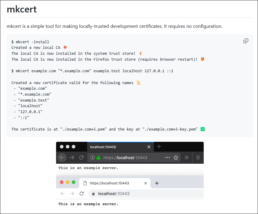 $ mkcert example.com “*.example.com” example.test localhost 127.0.0.1 ::1